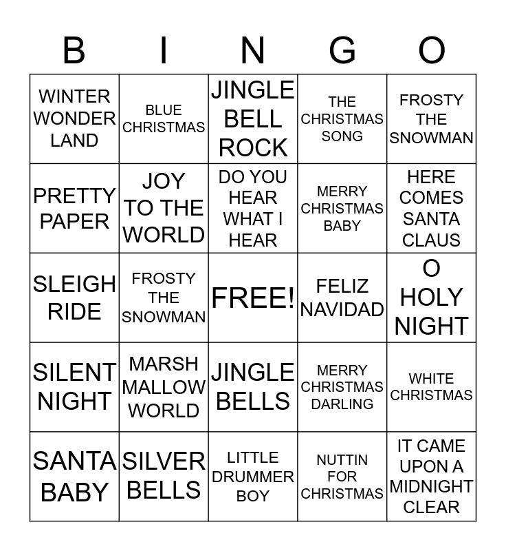 This bingo card has a free space and 24 words: MARSH MALLOW WORLD, SILVER BELLS, DO YOU HEAR WHAT I HEAR, SANTA BABY, FROSTY THE SNOWMAN, WINTER WONDER LAND, PRETTY PAPER, BLUE CHRISTMAS, FELIZ NAVIDAD, JINGLE BELLS, MERRY CHRISTMAS BABY, SLEIGH RIDE, MERRY CHRISTMAS DARLING, WHITE CHRISTMAS, JOY TO THE WORLD, NUTTIN FOR CHRISTMAS, O HOLY NIGHT, JINGLE BELL ROCK, HERE COMES SANTA CLAUS, FROSTY THE SNOWMAN, IT CAME UPON A MIDNIGHT CLEAR, SILENT NIGHT, THE CHRISTMAS SONG and LITTLE DRUMMER BOY.