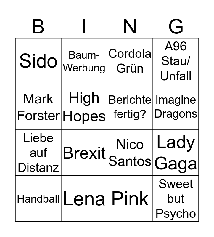 This bingo card has 16 words: Lena, Lady Gaga, Cordola Grün, Sido, Liebe auf Distanz, Baum-Werbung, Nico Santos, Pink, Mark Forster, High Hopes, Handball, A96 Stau/ Unfall, Brexit, Imagine Dragons, Berichte fertig? and Sweet but Psycho.