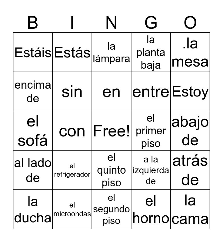 This bingo card has a free space and 43 words: el armario, la cama, el cuarto piso, la ducha, la estufa, el horno, la lámpara, la lavadora, .la mesa, el microondas, la planta baja, el primer piso, el quinto piso, el refrigerador, el retrete/el inodoro, el segundo piso, la silla, el sofá, el tercer piso, Estoy, Estás, Está, Estamos, Estáis, Están, abajo de, afuera de, a la derecha de, a la izquierda de, al lado de, arriba de, atrás de, cerca de, con, debajo de, delante de, detrás de, en, encima de, entre, lejos de, sin and sobre.