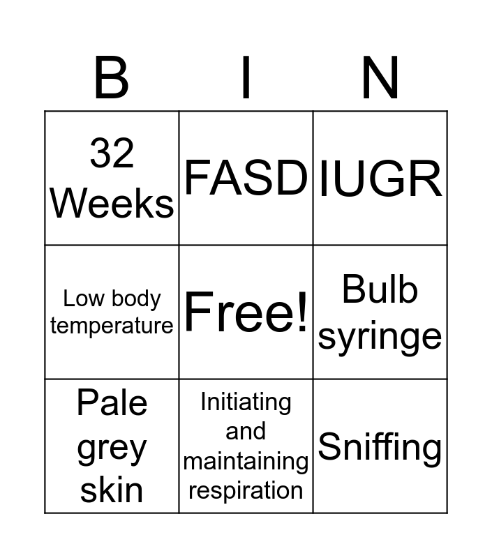 This bingo card has a free space and 8 words: Bulb syringe, IUGR, FASD, Pale grey skin, 32 Weeks, Sniffing, Low body temperature and Initiating and maintaining respiration.