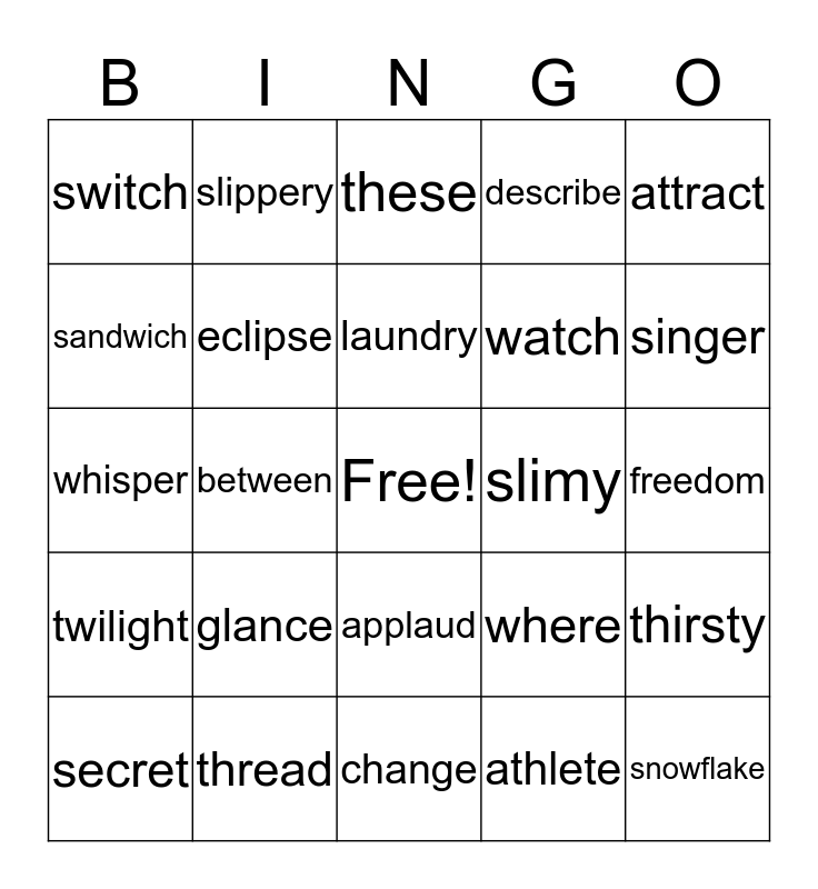 This bingo card has a free space and 39 words: bridge, gravity, hungry, eclipse, secret, applaud, laundry, trouble, attract, twilight, between, describe, snowflake, freedom, slimy, glance, burglar, switch, attach, where, sandwich, change, watch, singer, slippery, Spring, gather, these, thread, slippery, Spring, gather, these, thread, athlete, worth, thirsty, whisper and whistle.
