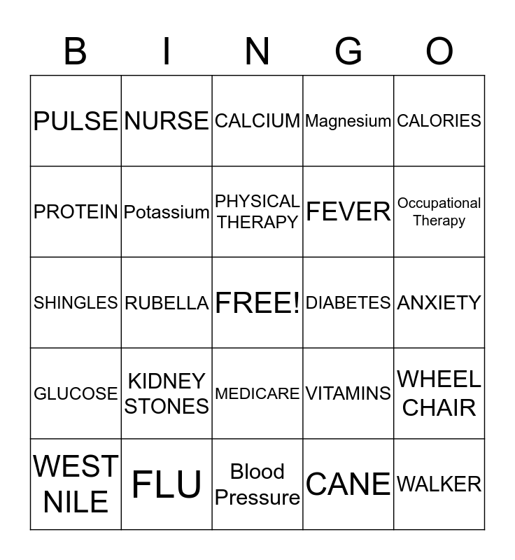This bingo card has a free space and 24 words: KIDNEY STONES, FLU, PHYSICAL THERAPY, WEST NILE, CALORIES, PULSE, PROTEIN, NURSE, DIABETES, MEDICARE, FEVER, SHINGLES, VITAMINS, WHEEL CHAIR, Potassium, CANE, ANXIETY, CALCIUM, Occupational Therapy, RUBELLA, WALKER, GLUCOSE, Magnesium and Blood Pressure.