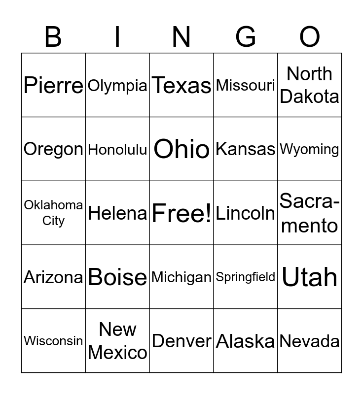 This bingo card has a free space and 27 words: Springfield, St. Paul, Kansas, Denver, Oregon, Texas, Olympia, Arizona, Lincoln, Utah, Oklahoma City, Missouri, Wisconsin, New Mexico, Wyoming, Des Moines, Honolulu, Ohio, Boise, Pierre, Sacra-mento, Alaska, Helena, Nevada, Michigan, North Dakota and Indian-apolis.