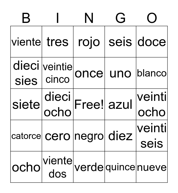 This bingo card has a free space and 24 words: cero, viente dos, once, ocho, doce, viente, dieci sies, tres, azul, negro, uno, siete, diez, veinti seis, veintie cinco, quince, veinti ocho, rojo, blanco, dieci ocho, nueve, catorce, seis and verde.