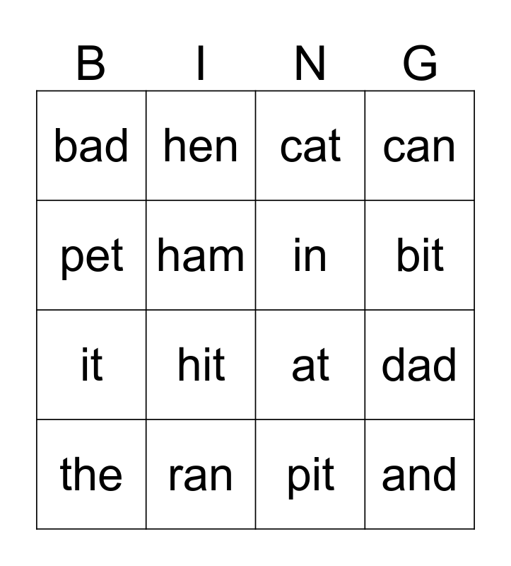 This bingo card has 16 words: ran, dad, cat, bad, it, hen, at, pit, pet, ham, the, can, hit, bit, in and and.