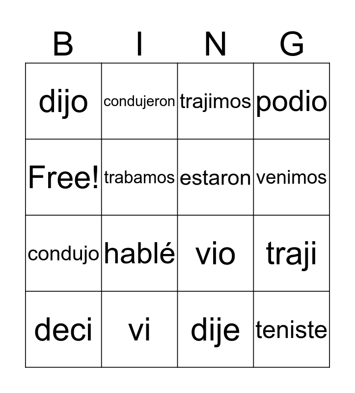 This bingo card has 16 words: vi, traji, trajimos, dijo, condujo, condujeron, vio, dije, Free!, trabamos, deci, podio, hablé, venimos, estaron and teniste.