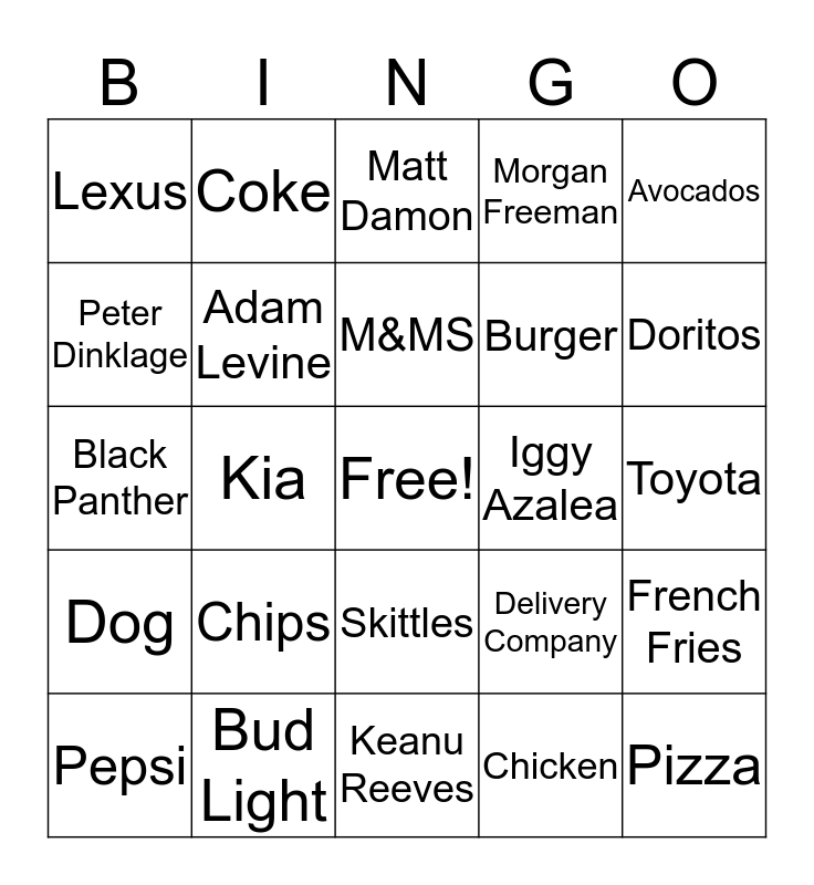 This bingo card has a free space and 24 words: Chips, Bud Light, M&MS, Pepsi, Avocados, Lexus, Peter Dinklage, Coke, Iggy Azalea, Skittles, Burger, Black Panther, Delivery Company, French Fries, Adam Levine, Chicken, Toyota, Matt Damon, Doritos, Kia, Pizza, Dog, Morgan Freeman and Keanu Reeves.