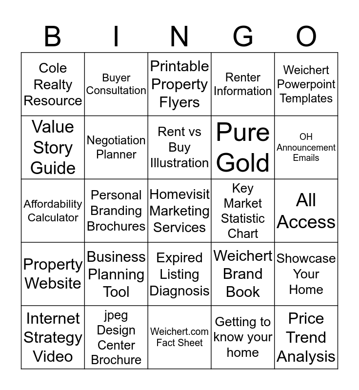 This bingo card has 25 words: Business Planning Tool, Weichert.com Fact Sheet, Rent vs Buy Illustration, Internet Strategy Video, Weichert Powerpoint Templates, Cole Realty Resource, Value Story Guide, Buyer Consultation, Key Market Statistic Chart, Expired Listing Diagnosis, Pure Gold, Affordability Calculator, Weichert Brand Book, Showcase Your Home, Negotiation Planner, Price Trend Analysis, All Access, Printable Property Flyers, OH Announcement Emails, Personal Branding Brochures, Homevisit Marketing Services, jpeg Design Center Brochure, Property Website, Renter Information and Getting to know your home.