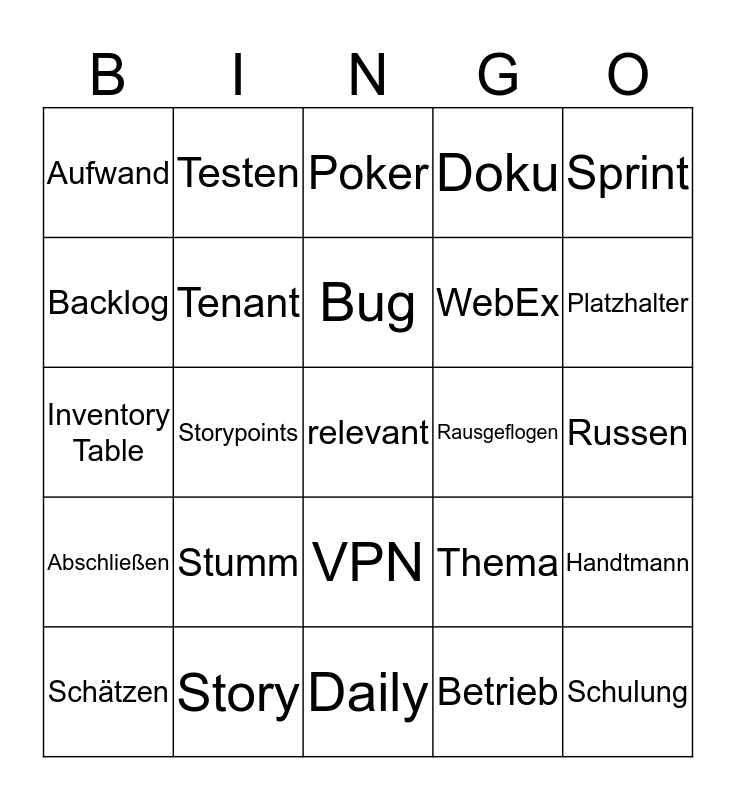 This bingo card has a free space and 24 words: Stumm, Story, Bug, Schätzen, Sprint, Aufwand, Backlog, Testen, Rausgeflogen, VPN, WebEx, Inventory Table, Thema, Handtmann, Tenant, Betrieb, Russen, Poker, Platzhalter, Storypoints, Schulung, Abschließen, Doku and Daily.