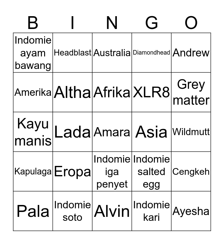 This bingo card has a free space and 24 words: Eropa, Indomie soto, Afrika, Pala, Andrew, Indomie ayam bawang, Amerika, Headblast, Asia, Indomie iga penyet, XLR8, Kayu manis, Indomie salted egg, Cengkeh, Altha, Indomie kari, Wildmutt, Australia, Grey matter, Lada, Ayesha, Kapulaga, Diamondhead and Alvin.