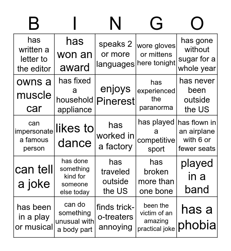 This bingo card has a free space and 24 words: has done something kind for someone else today, can do something unusual with a body part, enjoys Pinerest, has been in a play or musical, has gone without sugar for a whole year, has written a letter to the editor, owns a muscle car, has won an award, has played a competitive sport, has traveled outside the US, has experienced the paranorma, can impersonate a famous person, has broken more than one bone, played in a band, has fixed a household appliance, been the victim of an amazing practical joke, has flown in an airplane with 6 or fewer seats, speaks 2 or more languages, has never been outside the US, likes to dance, has a phobia, can tell a joke, wore gloves or mittens here tonight and finds trick-o-treaters annoying.