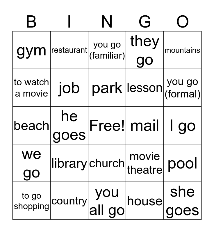 This bingo card has a free space and 24 words: library, country, park, to go shopping, mountains, gym, to watch a movie, restaurant, mail, church, lesson, beach, movie theatre, pool, job, house, I go, you go (familiar), you go (formal), he goes, she goes, we go, they go and you all go.