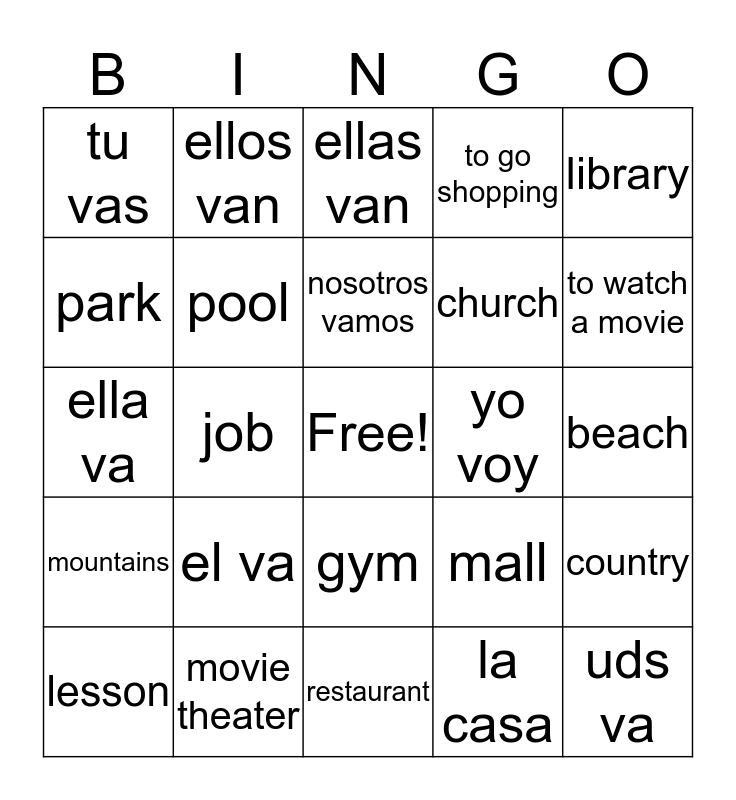 This bingo card has a free space and 24 words: el va, movie theater, nosotros vamos, lesson, library, tu vas, park, ellos van, yo voy, gym, church, ella va, mall, country, pool, la casa, beach, ellas van, to watch a movie, job, uds va, mountains, to go shopping and restaurant.