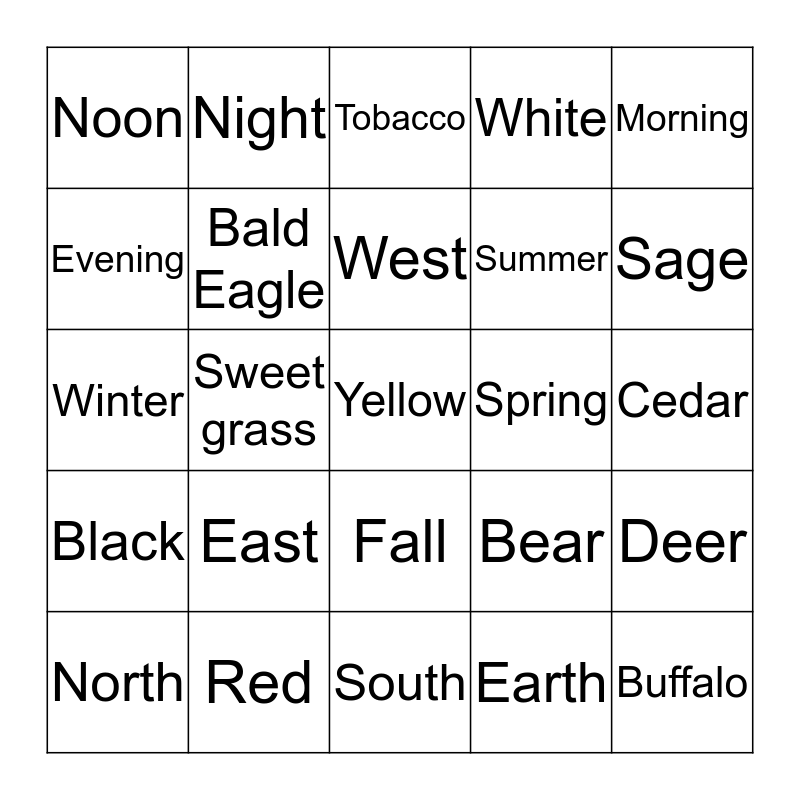This bingo card has 25 words: East, South, West, North, Morning, Noon, Evening, Night, Spring, Fall, Summer, Winter, Bear, Deer, Bald Eagle, Buffalo, Cedar, Tobacco, Sage, Sweet grass, Yellow, Red, Black, White and Earth.