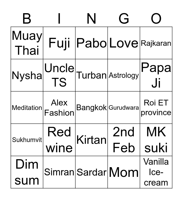 This bingo card has 25 words: Red wine, Sardar, Turban, Dim sum, Rajkaran, Muay Thai, Nysha, Fuji, Gurudwara, Kirtan, Astrology, Meditation, 2nd Feb, MK suki, Uncle TS, Vanilla Ice-cream, Roi ET province, Pabo, Papa Ji, Alex Fashion, Bangkok, Simran, Sukhumvit, Love and Mom.