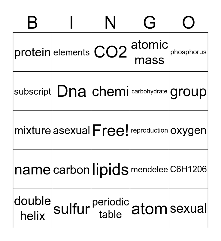 This bingo card has a free space and 24 words: carbon, sulfur, chemi, double helix, phosphorus, protein, subscript, elements, reproduction, lipids, carbohydrate, mixture, mendelee, C6H1206, Dna, atom, oxygen, CO2, group, asexual, sexual, name, atomic mass and periodic table.