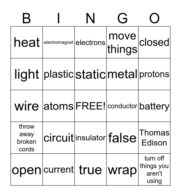 This bingo card has a free space and 24 words: circuit, current, static, open, closed, heat, light, electromagnet, conductor, insulator, metal, wire, false, Thomas Edison, plastic, wrap, battery, electrons, protons, atoms, turn off things you aren't using, throw away broken cords, move things and true.