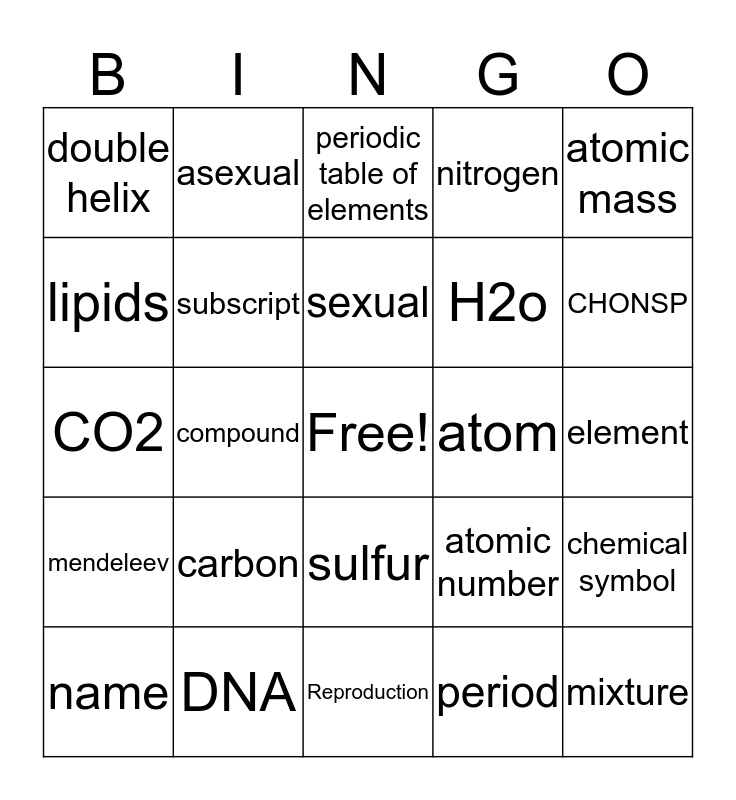 This bingo card has a free space and 24 words: carbon, DNA, sexual, name, atomic mass, double helix, lipids, asexual, atom, sulfur, H2o, CO2, atomic number, chemical symbol, subscript, period, element, periodic table of elements, CHONSP, compound, mixture, mendeleev, nitrogen and Reproduction.