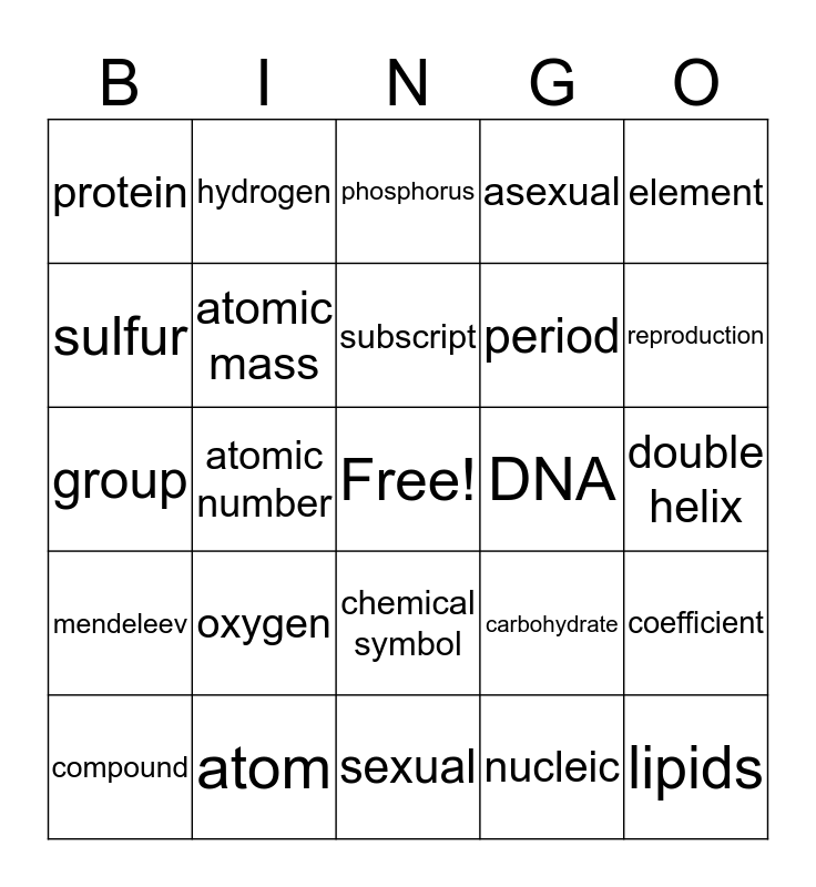 This bingo card has a free space and 24 words: oxygen, atom, subscript, compound, element, protein, sulfur, hydrogen, DNA, chemical symbol, period, group, carbohydrate, coefficient, atomic mass, nucleic, double helix, phosphorus, reproduction, atomic number, lipids, mendeleev, asexual and sexual.