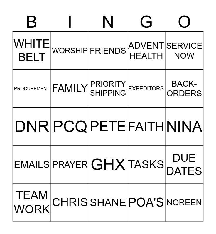 This bingo card has a free space and 29 words: TEAM WORK, ME'S, PCQ, GREEN BELT, WHITE BELT, FRIENDS, FAMILY, PRAYER, FAITH, CHRIS, NINA, NOREEN, SHANE, POA'S, BACK-ORDERS, FUN, GHX, EMAILS, SERVICE NOW, DNR, TASKS, BUYERS, EXPEDITORS, PROCUREMENT, ADVENT HEALTH, WORSHIP, DUE DATES, PRIORITY SHIPPING and OBIEE.