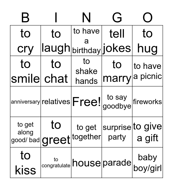 This bingo card has a free space and 24 words: to greet, to congratulate, to shake hands, to kiss, to hug, to cry, to smile, to laugh, to say goodbye, to get together, to marry, anniversary, surprise party, to give a gift, to chat, parade, fireworks, to have a birthday, to have a picnic, relatives, baby boy/girl, to get along good/ bad, tell jokes and house.