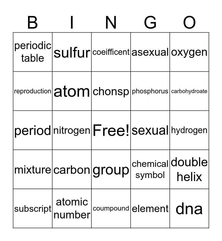 This bingo card has a free space and 24 words: carbon, atomic number, chonsp, subscript, oxygen, periodic table, reproduction, sulfur, sexual, group, phosphorus, period, chemical symbol, double helix, atom, element, hydrogen, coeifficent, carbohydroate, nitrogen, dna, mixture, asexual and coumpound.