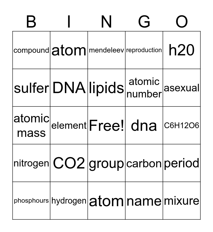 This bingo card has a free space and 24 words: CO2, hydrogen, lipids, phosphours, h20, compound, sulfer, atom, dna, group, atomic number, atomic mass, carbon, period, DNA, name, C6H12O6, mendeleev, asexual, element, mixure, nitrogen, reproduction and atom.