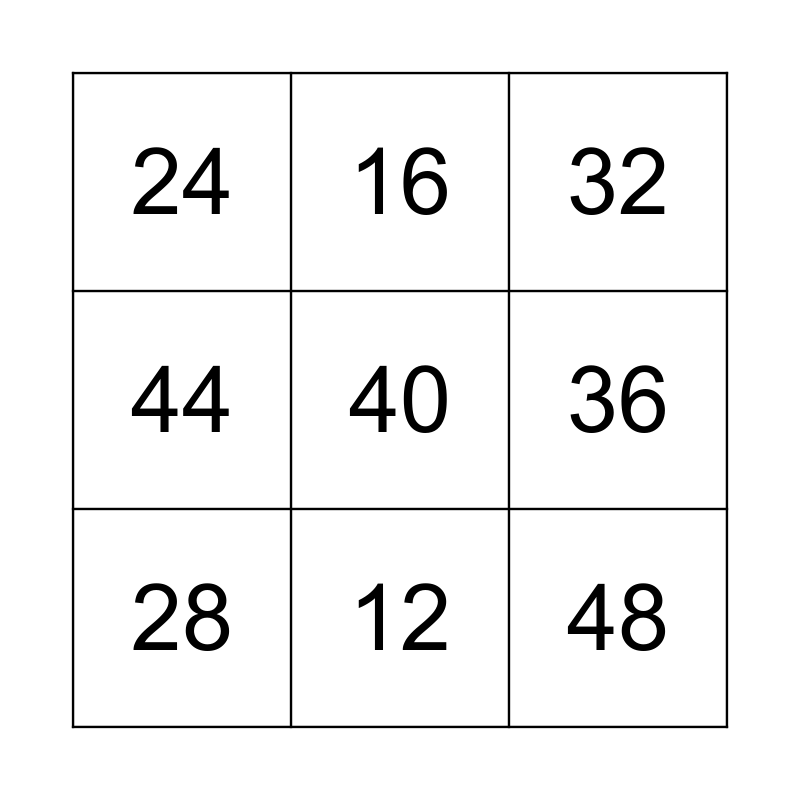 This bingo card has 12 words: 8, 12, 48, 44, 16, 36, 28, 20, 32, 24, 40 and 4.