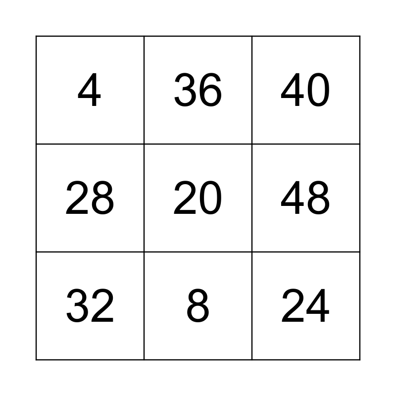 This bingo card has 11 words: 16, 20, 24, 32, 36, 40, 28, 44, 48, 4 and 8.