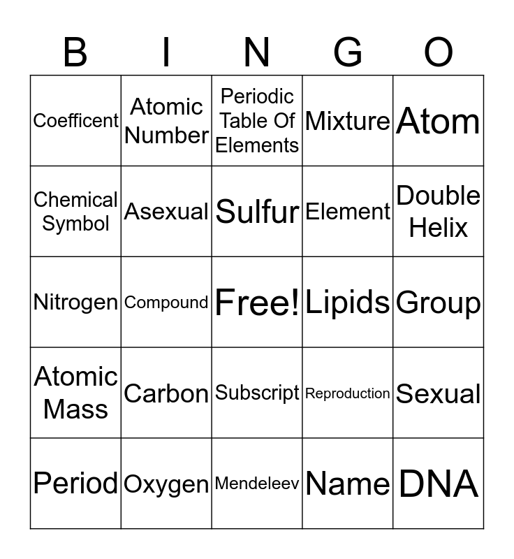 This bingo card has a free space and 24 words: Carbon, Oxygen, Sulfur, Period, Atom, Coefficent, Chemical Symbol, Atomic Number, Lipids, Subscript, Element, Nitrogen, Reproduction, Sexual, Asexual, Name, Group, Periodic Table Of Elements, Double Helix, Compound, DNA, Atomic Mass, Mixture and Mendeleev.