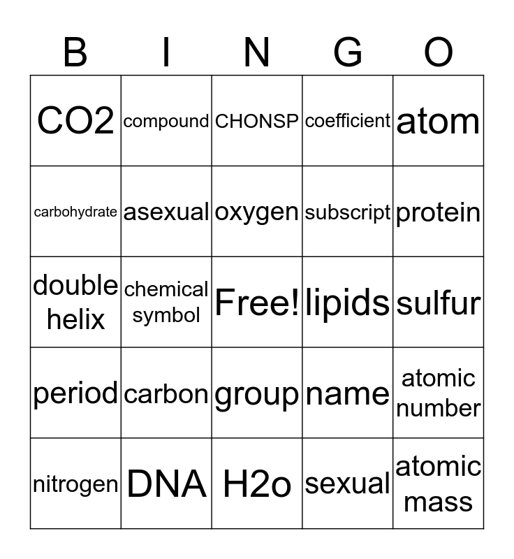 This bingo card has a free space and 24 words: carbon, DNA, oxygen, nitrogen, atom, CO2, carbohydrate, compound, lipids, group, subscript, double helix, name, atomic number, asexual, sexual, sulfur, CHONSP, protein, chemical symbol, atomic mass, period, coefficient and H2o.