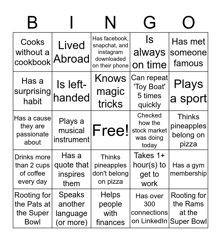 This bingo card has a free space and 24 words: Has a quote that inspires them, Speaks another language (or more), Knows magic tricks, Rooting for the Pats at the Super Bowl, Has met someone famous, Cooks without a cookbook, Has a surprising habit, Lived Abroad, Checked how the stock market was doing today, Thinks pineapples don't belong on pizza, Can repeat 'Toy Boat' 5 times quickly, Has a cause they are passionate about, Takes 1+ hour(s) to get to work, Has a gym membership, Is left-handed, Has over 300 connections on LinkedIn, Thinks pineapples belong on pizza, Has facebook, snapchat, and instagram downloaded on their phone, Plays a sport, Plays a musical instrument, Rooting for the Rams at the Super Bowl, Drinks more than 2 cups of coffee every day, Is always on time and Helps people with finances.