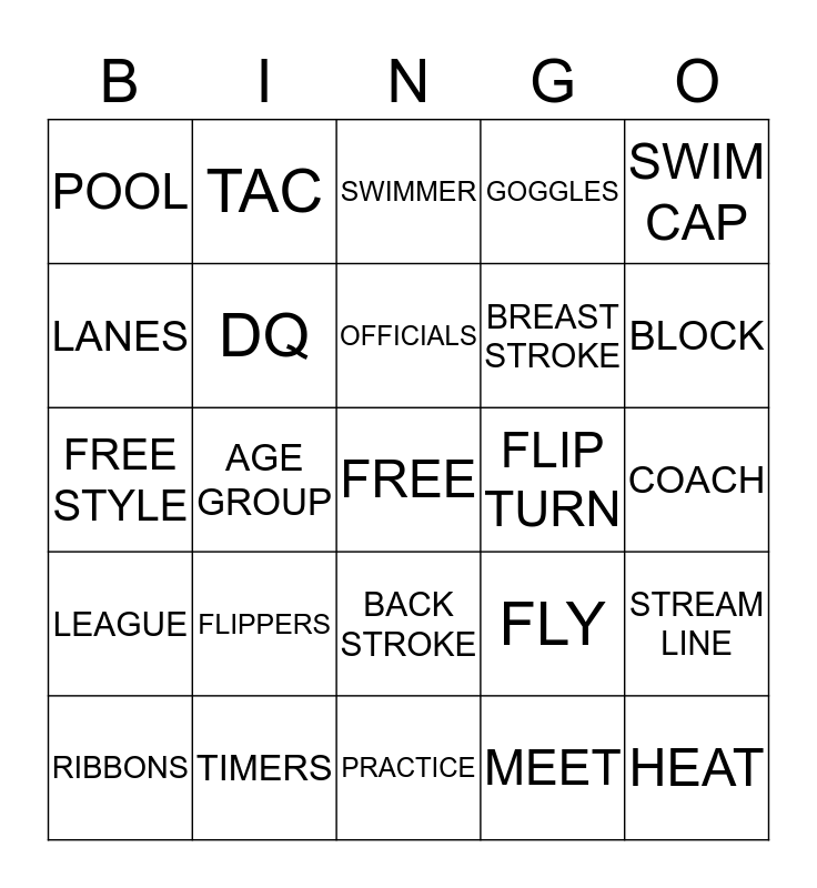 This bingo card has a free space and 24 words: FLIPPERS, TIMERS, OFFICIALS, RIBBONS, SWIM CAP, POOL, LANES, TAC, FLIP TURN, BACK STROKE, BREAST STROKE, FREE STYLE, FLY, STREAM LINE, DQ, MEET, COACH, SWIMMER, BLOCK, AGE GROUP, HEAT, LEAGUE, GOGGLES and PRACTICE.