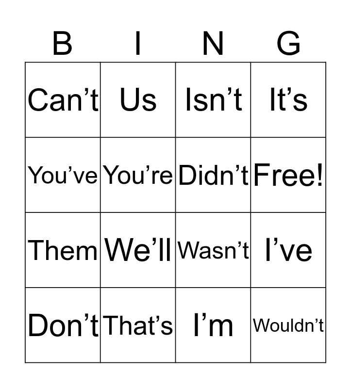 This bingo card has 17 words: I’m, Don’t, Isn’t, Can’t, We’ll, It’s, I’ve, Didn’t, Free!, You’re, That’s, Wasn’t, You’ve, Us, Them, They’re and Wouldn’t.