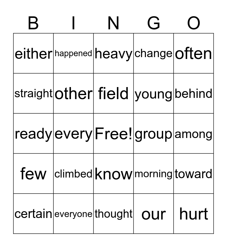 This bingo card has a free space and 35 words: find, sounds, were, other, know, change, straight, early, field, light, ready, often, second, apart, either, group, our, every, few, hurt, morning, certain, toward, everyone, heavy, behind, eyes, neither, young, among, upon, thought, climbed, happened and through.