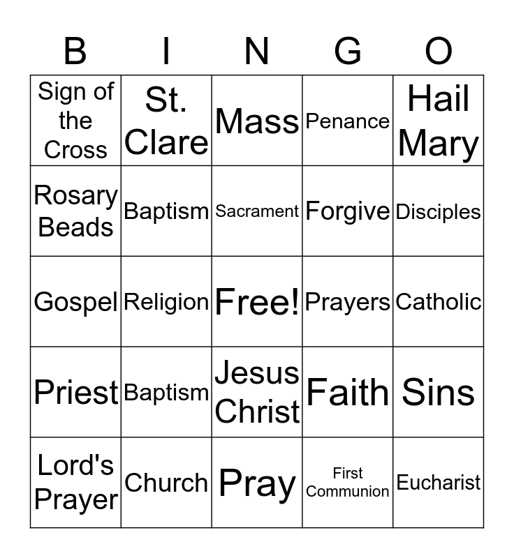 This bingo card has a free space and 24 words: Baptism, Church, Sacrament, Lord's Prayer, Hail Mary, Sign of the Cross, Rosary Beads, St. Clare, Prayers, Jesus Christ, Forgive, Gospel, Faith, Sins, Baptism, First Communion, Catholic, Mass, Disciples, Religion, Eucharist, Priest, Penance and Pray.