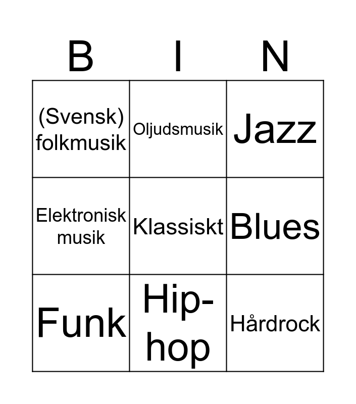 This bingo card has 12 words: Pop, Hårdrock, Klassiskt, Blues, Oljudsmusik, Jazz, Hip-hop, Dansband, (Svensk) folkmusik, Elektronisk musik, Funk and Kyrkomusik.