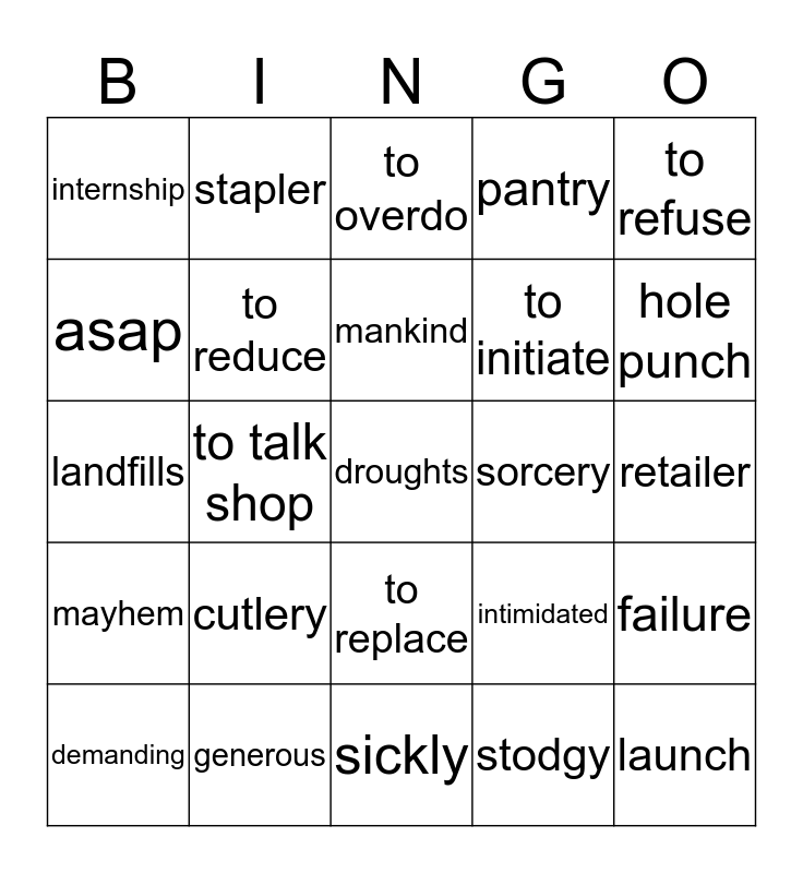 This bingo card has a free space and 24 words: demanding, cutlery, mankind, stodgy, to refuse, internship, stapler, to overdo, sorcery, retailer, landfills, to reduce, intimidated, failure, asap, generous, sickly, pantry, hole punch, mayhem, to talk shop, to replace, to initiate and launch.