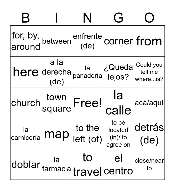 This bingo card has a free space and 127 words: el aeropuerto, airport, el banco, bank, el café, café/ coffee, la carnicería, butcher shop, el centro, center, downtown, el correo, post office, el centro comercial, shopping center, la estación de autobuses, bus station, la farmacia, pharmacy, el hotel, hotel, la iglesia, church, la joyería, jewelry store, la librería, book store, la panadería, bread bakery, la pastelería, pastry shop, la papelería, stationary store, la plaza, town square, la tienda de música y videos, music and video store, la zapatería, shoe store, la avenida, avenue, la calle, street, el camino, road, la dirección, address, direction, a pie, on foot/by foot, el autobús, bus, el avión, airplane, el barco, ship, el carro/ el coche, car, el metro, subway, la moto(cicleta), motorcycle, el taxi, taxi, el tren, train, Perdona(e), ¿cómo llego a...?, Pardon (inf./form.), how do I get to...?, ¿Puedes (Puede usted) decirme dónde queda...?, Could you tell me where...is?, ¿Queda lejos?, Is it far?, acá/aquí, here, allá/allí, there (way over there), ¡Cómo no!, Of course! (Why not?), Lo siento., I´m sorry., cerca (de), close/near to, cruzar, to cross, la cuadra/la mannzana, city block, delante (de), in front (of), a la derecha (de), to the right (of), derecho, straight ahead, desde, from, detrás (de), behind, doblar, to turn, enfrente (de), facing, entre, between, la esquina, corner, hasta, until/as far as, a la izquierda (de), to the left (of), al lado (de), beside, next to, lejos (de), far (from), quedar (en), to be located (in)/ to agree on, la cosa, thing, decir, to say/tell, manejar/conducir, to drive, el mapa, map, por, for, by, around, salir, to go out/leave, viajar, to travel and el viaje.