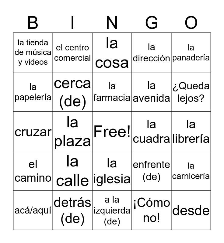 This bingo card has a free space and 64 words: el aeropuerto, el banco, el café, la carnicería, el centro, el correo, el centro comercial, la estación de autobuses, la farmacia, el hotel, la iglesia, la joyería, la librería, la panadería, la pastelería, la papelería, la plaza, la tienda de música y videos, la zapatería, la avenida, la calle, el camino, la dirección, a pie, el autobús, el avión, el barco, el carro/ el coche, el metro, la moto(cicleta), el taxi, el tren, Perdona(e), ¿cómo llego a...?, ¿Puedes (Puede usted) decirme dónde queda...?, ¿Queda lejos?, acá/aquí, allá/allí, ¡Cómo no!, Lo siento., cerca (de), cruzar, la cuadra, delante (de), a la derecha (de), derecho, desde, detrás (de), doblar, enfrente (de), entre, la esquina, hasta, a la izquierda (de), al lado (de), lejos (de), quedar (en), la cosa, decir, manejar/conducir, el mapa, por, salir, viajar and el viaje.