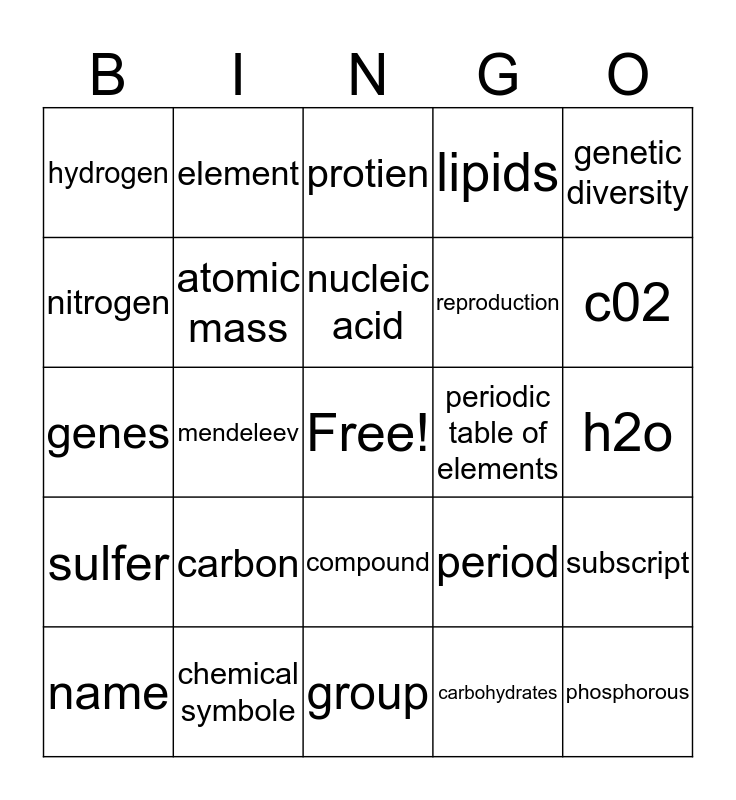 This bingo card has a free space and 24 words: carbon, chemical symbole, nucleic acid, name, genetic diversity, hydrogen, nitrogen, element, periodic table of elements, compound, reproduction, genes, period, subscript, atomic mass, carbohydrates, h2o, protien, c02, mendeleev, phosphorous, sulfer, lipids and group.