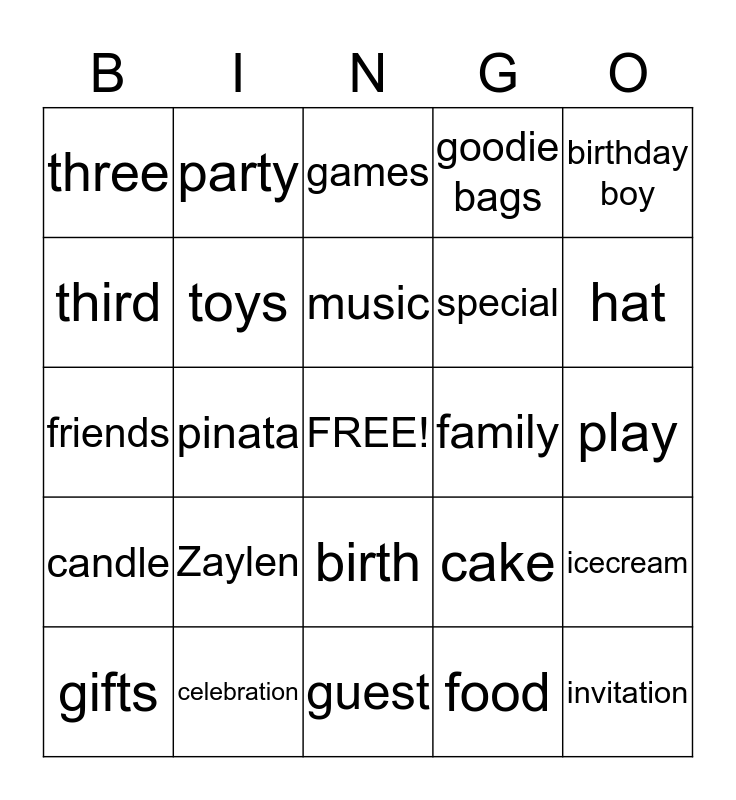 This bingo card has a free space and 24 words: Zaylen, celebration, music, gifts, birthday boy, three, third, party, family, birth, special, friends, cake, icecream, toys, food, play, games, hat, pinata, invitation, candle, goodie bags and guest.
