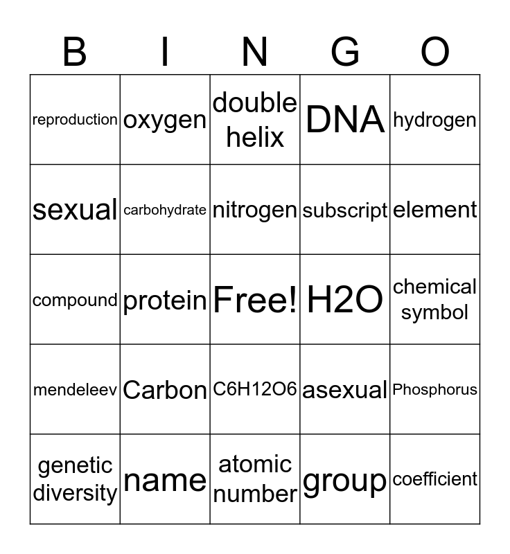 This bingo card has a free space and 24 words: Carbon, name, nitrogen, genetic diversity, hydrogen, reproduction, sexual, oxygen, H2O, C6H12O6, subscript, compound, asexual, Phosphorus, carbohydrate, group, chemical symbol, double helix, element, protein, coefficient, mendeleev, DNA and atomic number.