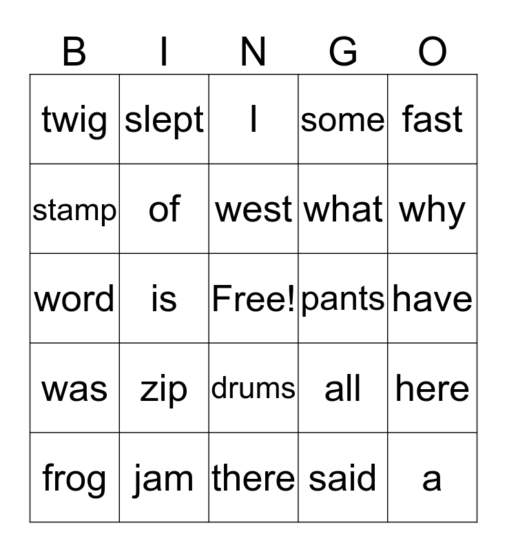 This bingo card has a free space and 24 words: zip, jam, west, frog, fast, twig, stamp, slept, pants, drums, what, word, all, here, of, said, have, I, why, is, a, was, some and there.