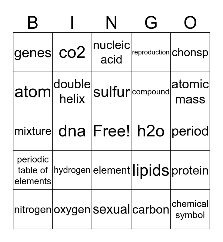 This bingo card has a free space and 24 words: hydrogen, oxygen, sulfur, nitrogen, chonsp, genes, atom, co2, h2o, element, compound, mixture, lipids, protein, double helix, carbon, period, nucleic acid, atomic mass, dna, chemical symbol, periodic table of elements, reproduction and sexual.