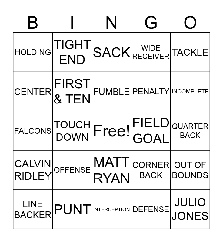 This bingo card has a free space and 24 words: OFFENSE, PUNT, FUMBLE, LINE BACKER, TACKLE, HOLDING, CENTER, TIGHT END, FIELD GOAL, MATT RYAN, PENALTY, FALCONS, CORNER BACK, OUT OF BOUNDS, FIRST & TEN, DEFENSE, QUARTER BACK, SACK, INCOMPLETE, TOUCH DOWN, JULIO JONES, CALVIN RIDLEY, WIDE RECEIVER and INTERCEPTION.