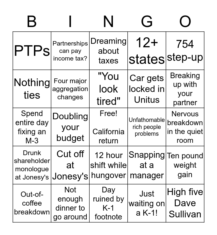 This bingo card has a free space and 42 words: Someone crying in their cube, "You look tired", Reprint BNA reports 5x, Cut off at Jonesy's, Just waiting on a K-1!, Ten pound weight gain, High five Dave Sullivan, Browsing industry jobs on LinkedIn, Dreaming about taxes, 12 hour shift while hungover, Nervous breakdown in the quiet room, Breaking up with your partner, Doubling your budget, 754 step-up, Belizean again?, Snapping at a manager, Trust fund baby, Spend entire day fixing an M-3, "But I could do it last year", Partnerships can pay income tax?, Nothing ties, Tinder match asks for free tax advice, Desk beer, PTPs, Basic math errors in front of PIC, "Livin' the dream!", Car gets locked in Unitus, Download Expensify; use it once, Spend 2 hours chasing less than $20, TJEs do not hit the B/S!!!, Form changes mid-prep, Drunk shareholder monologue at Jonesy's, Four major aggregation changes, Day ruined by K-1 footnote, Thank god I'm not signing this, Out-of-coffee breakdown, Not enough dinner to go around, Unfathomable rich people problems, Tripling your budget, Long Summary, 12+ states and Habte saves the day.