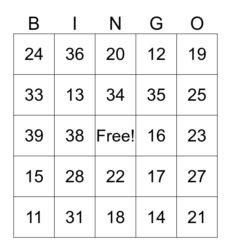 This bingo card has a free space and 24 words: 11, 28, 34, 14, 19, 24, 36, 20, 16, 23, 39, 13, 17, 27, 33, 31, 18, 12, 25, 15, 38, 22, 35 and 21.