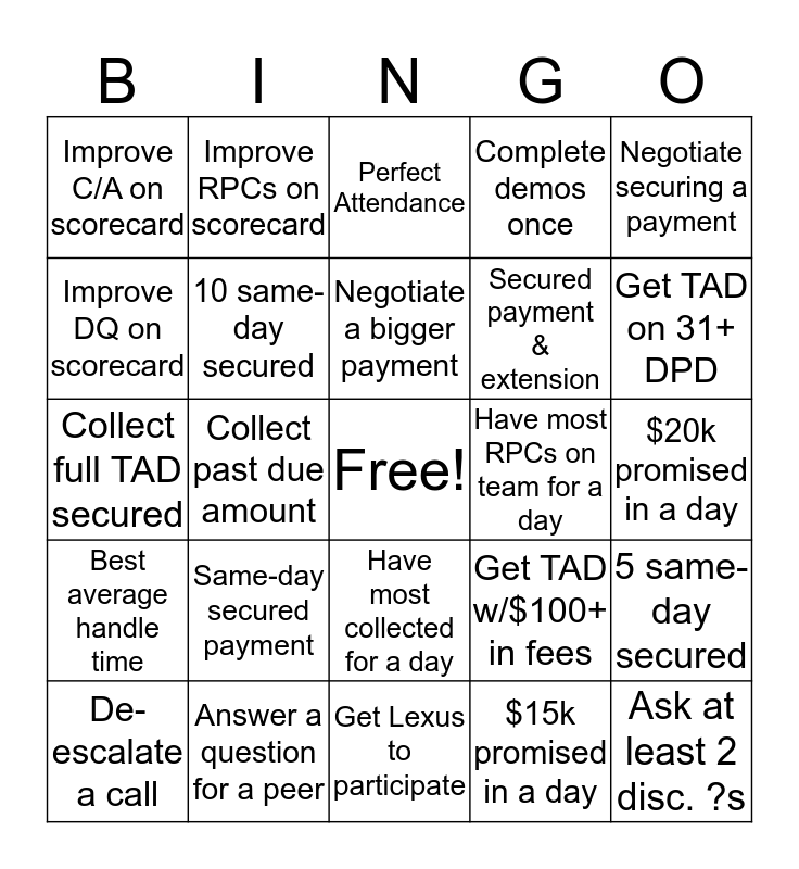 This bingo card has a free space and 24 words: Same-day secured payment, Answer a question for a peer, Negotiate a bigger payment, De-escalate a call, Negotiate securing a payment, Improve C/A on scorecard, Improve DQ on scorecard, Improve RPCs on scorecard, Have most RPCs on team for a day, Have most collected for a day, Secured payment & extension, Collect full TAD secured, Get TAD w/$100+ in fees, 5 same-day secured, 10 same-day secured, $15k promised in a day, $20k promised in a day, Perfect Attendance, Get TAD on 31+ DPD, Collect past due amount, Ask at least 2 disc. ?s, Best average handle time, Complete demos once and Get Lexus to participate.