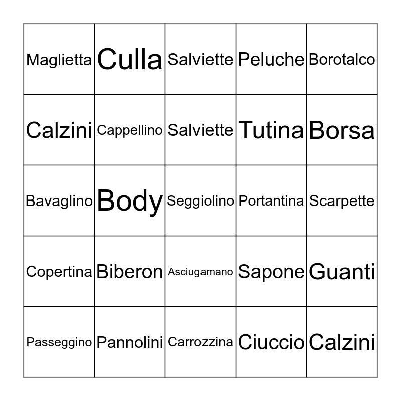 This bingo card has a free space and 24 words: Biberon, Pannolini, Salviette, Passeggino, Borotalco, Maglietta, Calzini, Culla, Portantina, Asciugamano, Tutina, Bavaglino, Sapone, Guanti, Cappellino, Ciuccio, Scarpette, Salviette, Borsa, Body, Calzini, Copertina, Peluche and Carrozzina.